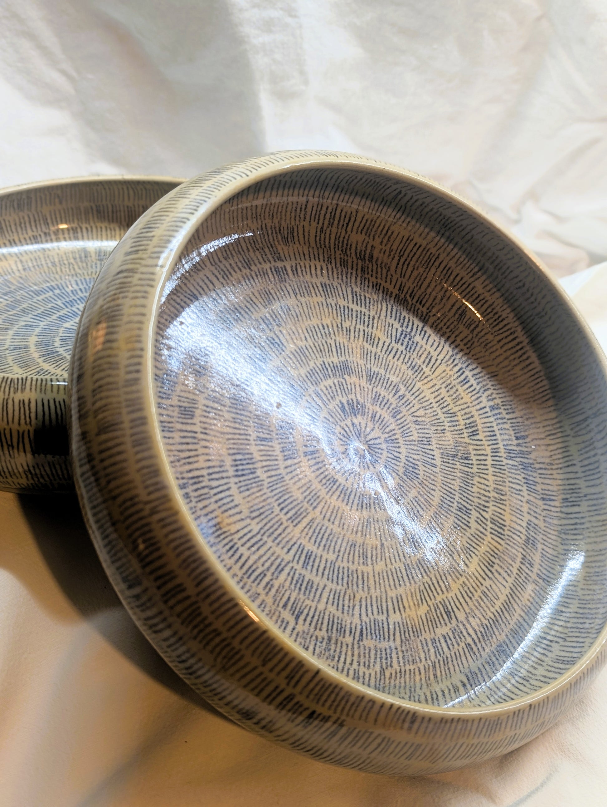Shaped on the wheel, with sandstone from Saint Amand. Decorated with a brush with oxide juice (background color) and with oxide pencil (small lines), then covered with a transparent shiny enamel.