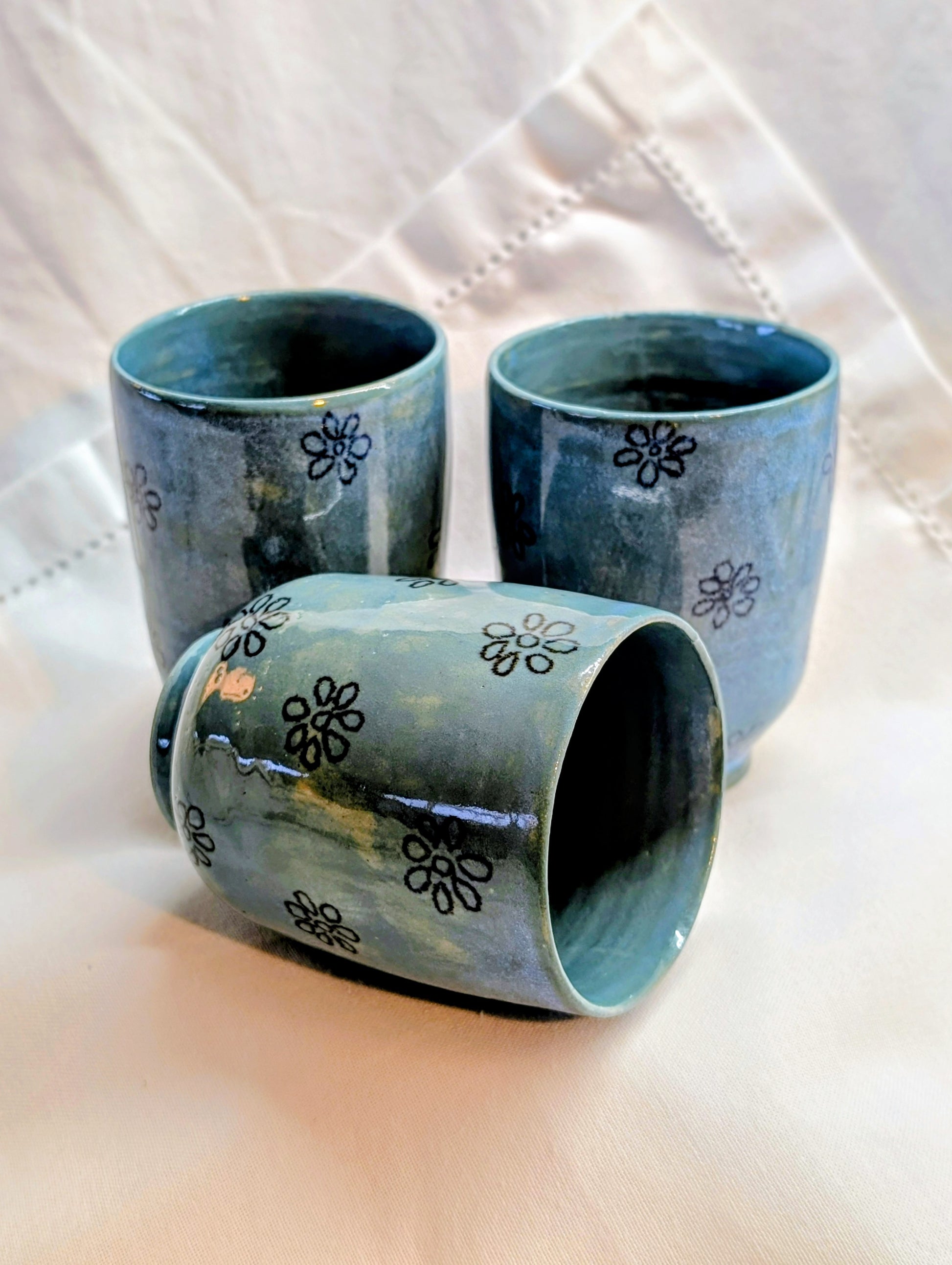 Façonnée à la main, au tour, avec du grès de Saint Amand. Elle est recouverte d'une engobe bleue puis les petites fleurs sont dessinées au crayon d'oxyde. La tasse est ensuite recouverte d''un émail brillant transparent.