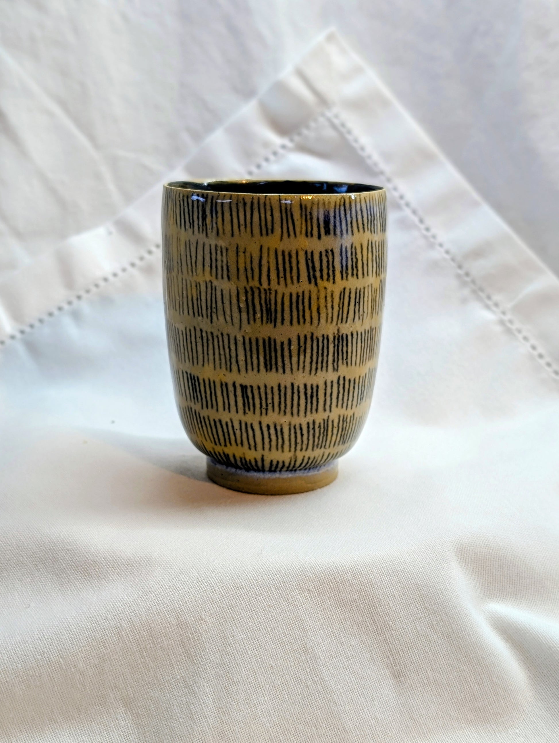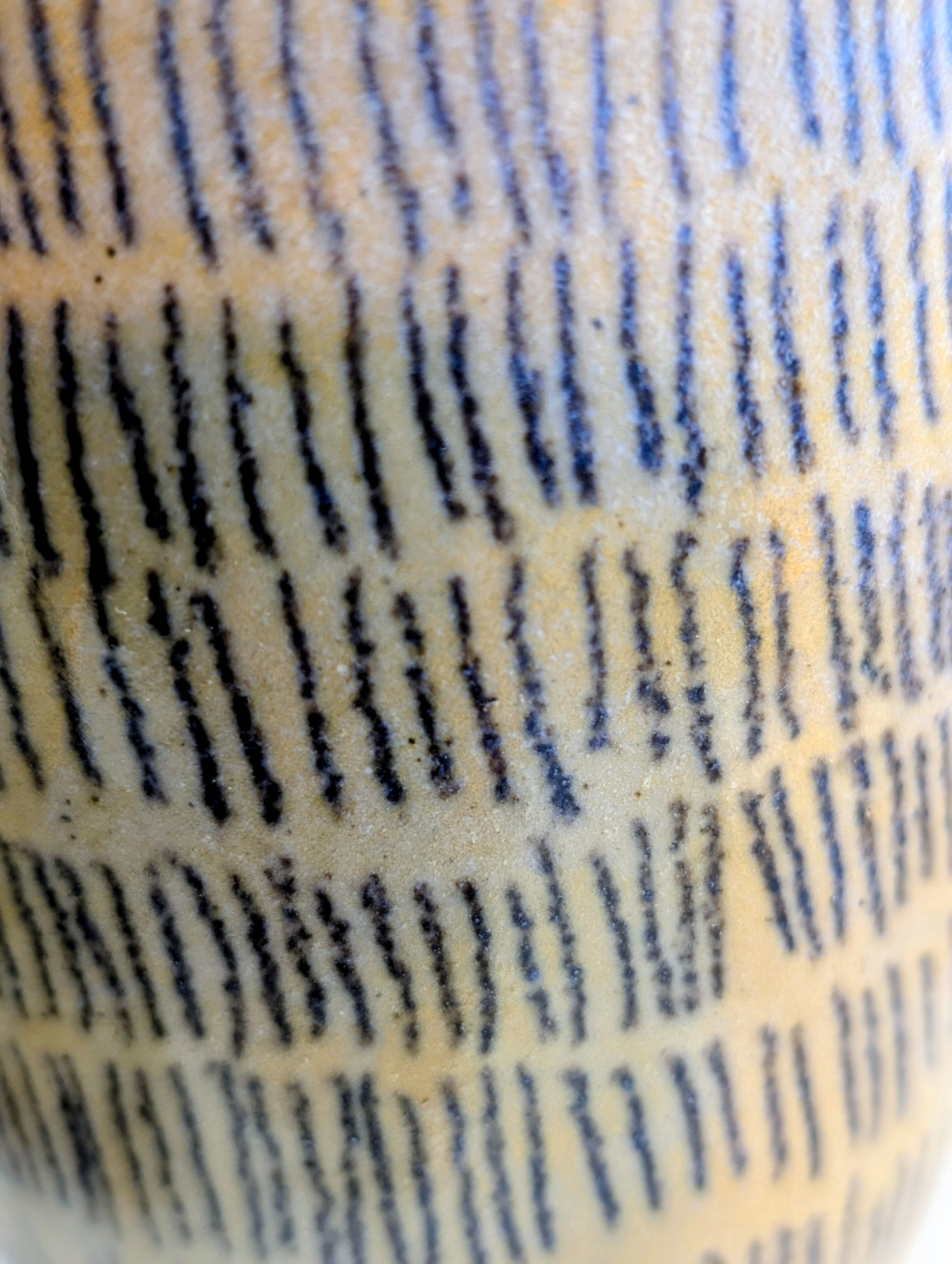 Façonnée à la main, au tour, avec du grès de Saint Amand. Décorée au pinceau avec des jus d'oxyde (couleur de fond) à l'extérieur, avec de l'engoge de grès noir à l'intérieur et au crayon d'oxyde (petits traits), puis recouvert d'un émail brillant transparent.