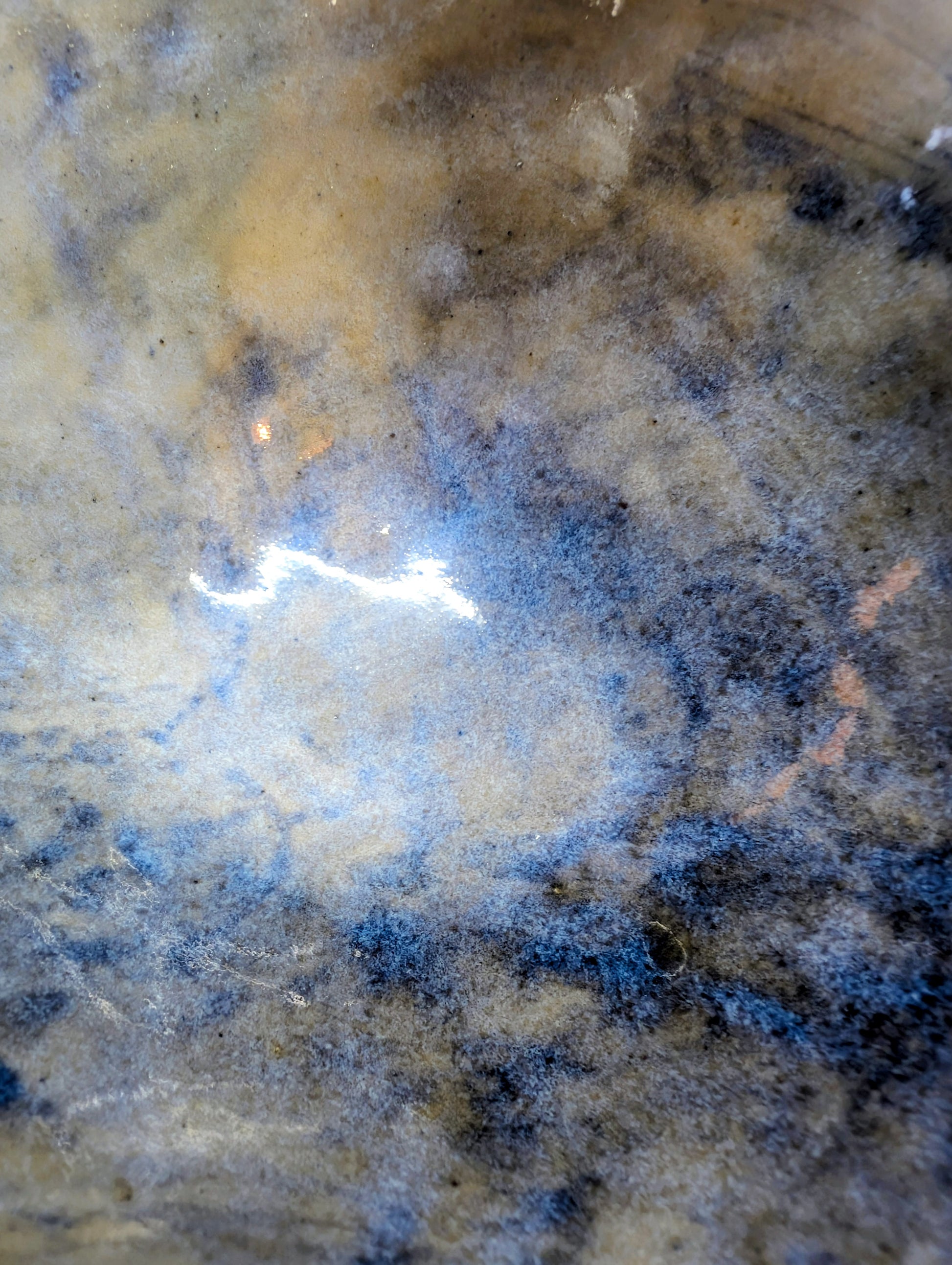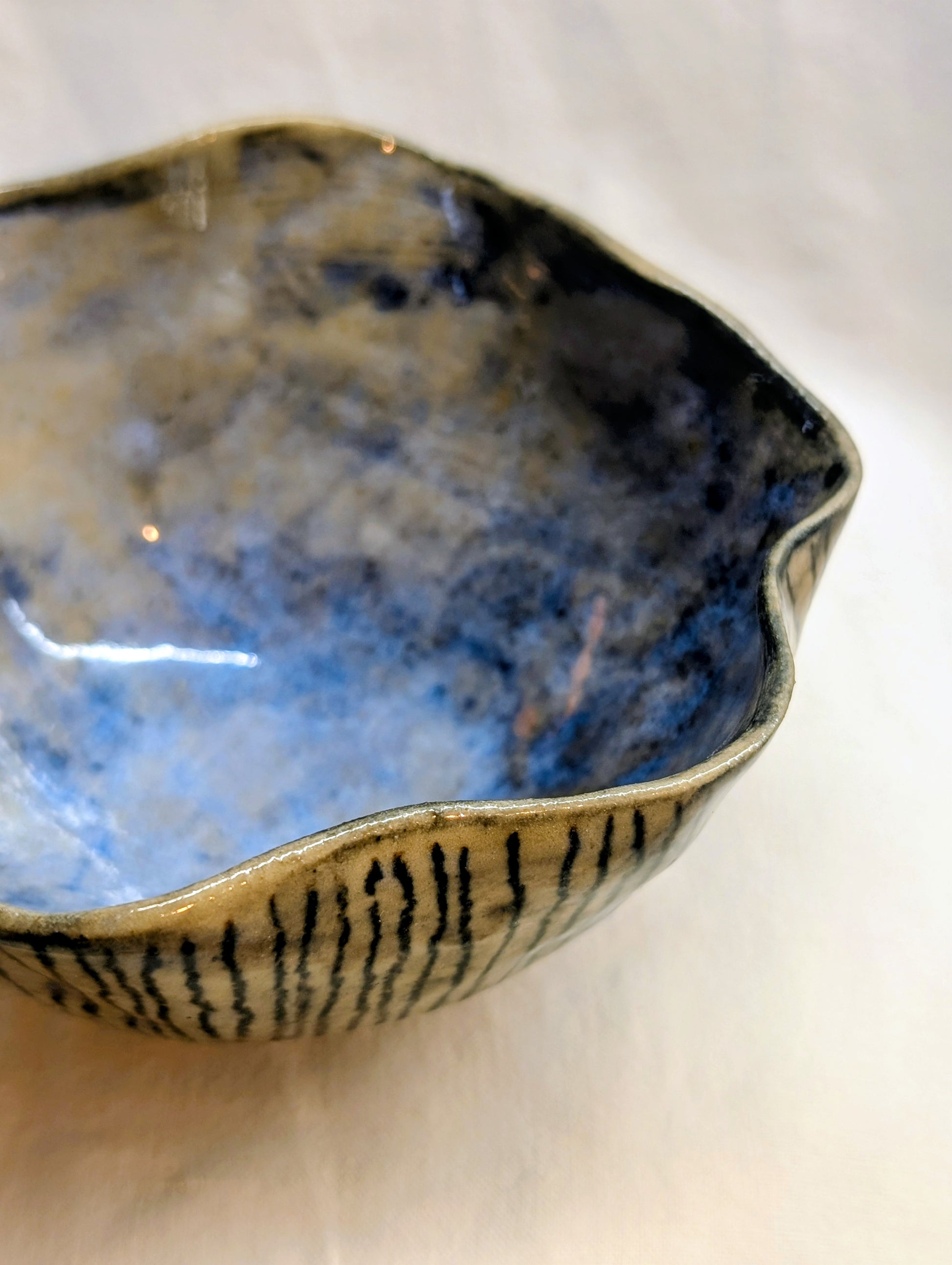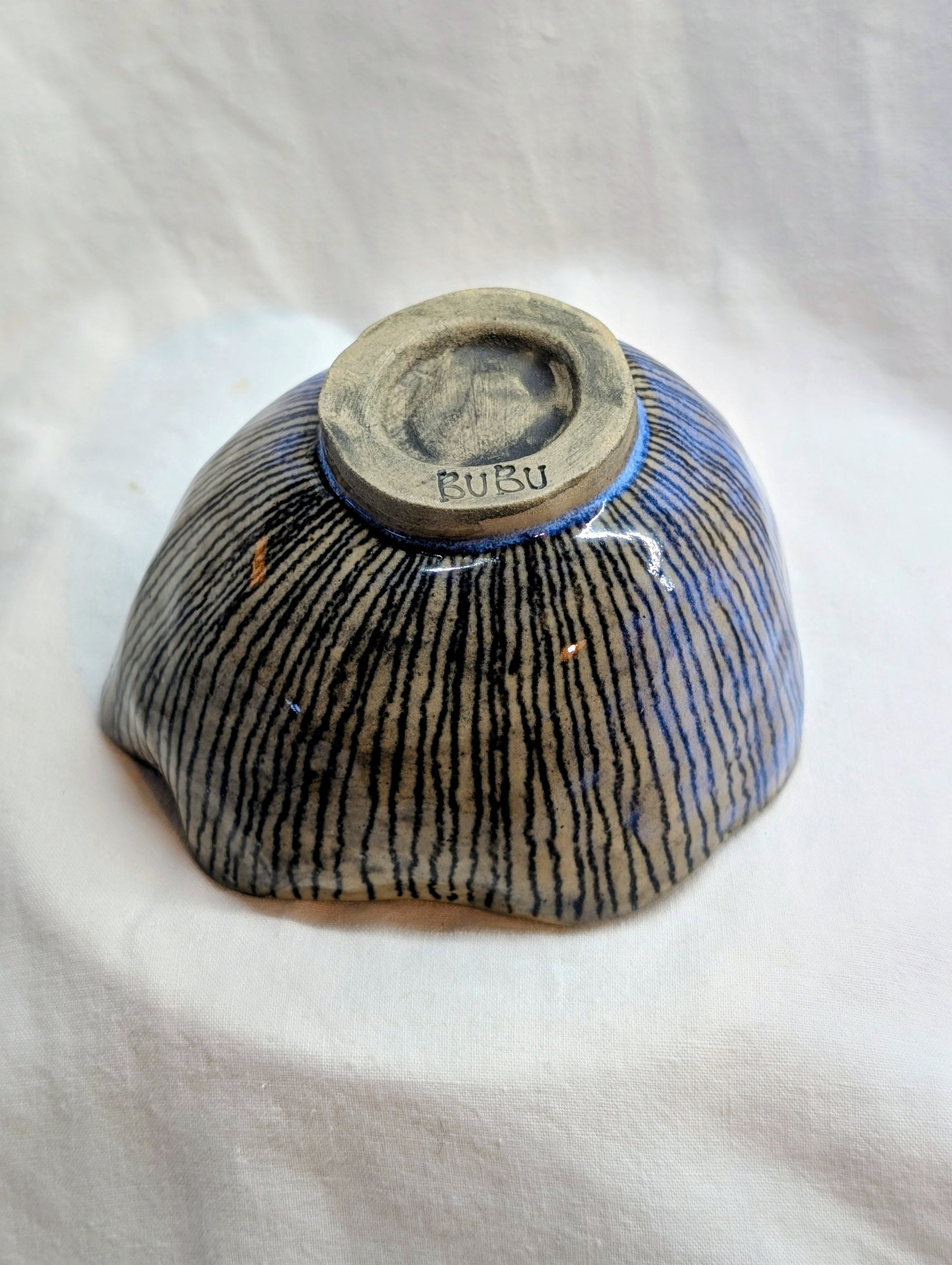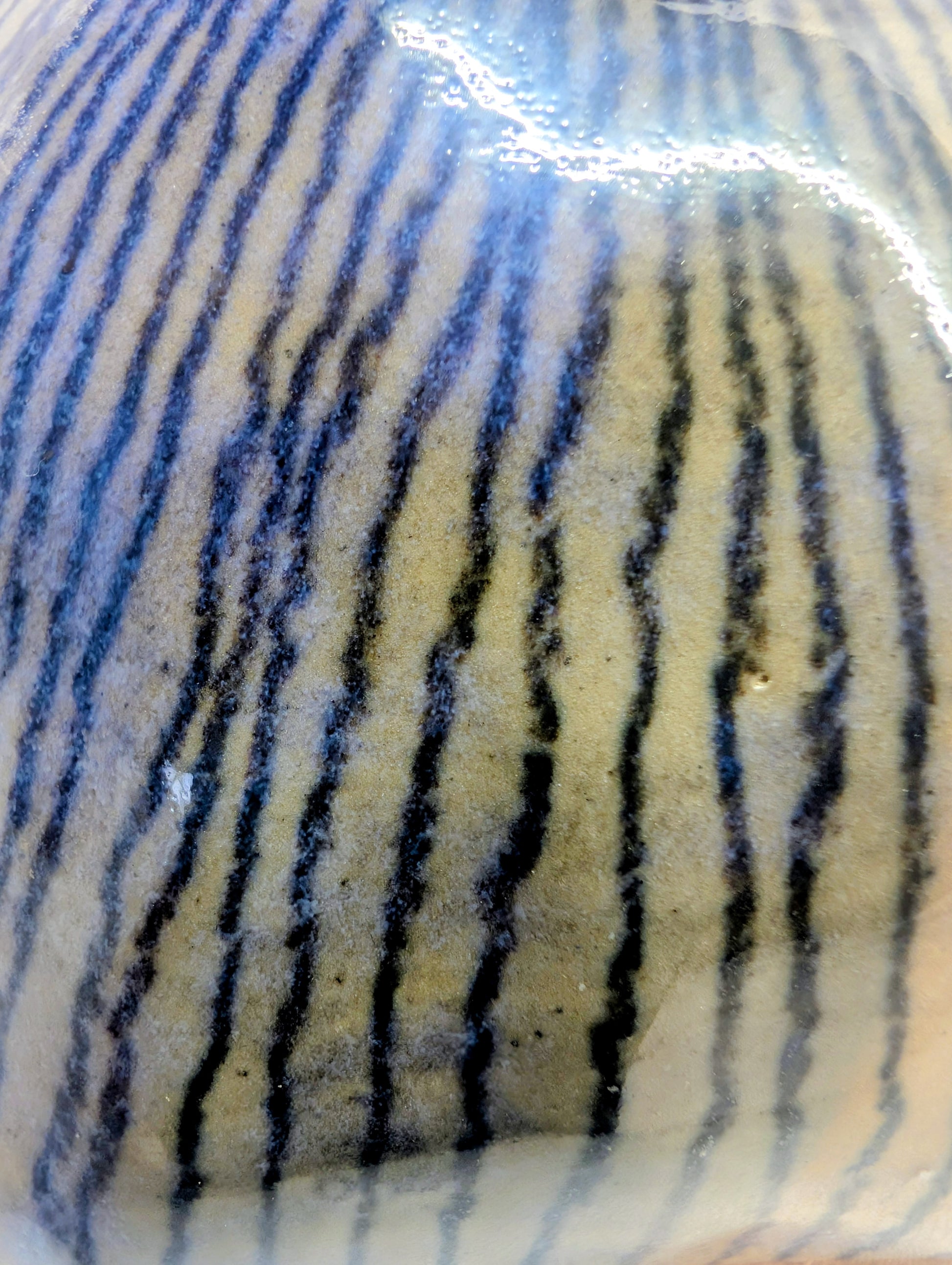 Façonnée à la main, au tour, avec du grès de Saint Amand. Décorée au pinceau avec des jus d'oxyde (couleur de fond) et au crayon d'oxyde (rayures), puis recouvert d'un émail brillant transparent.